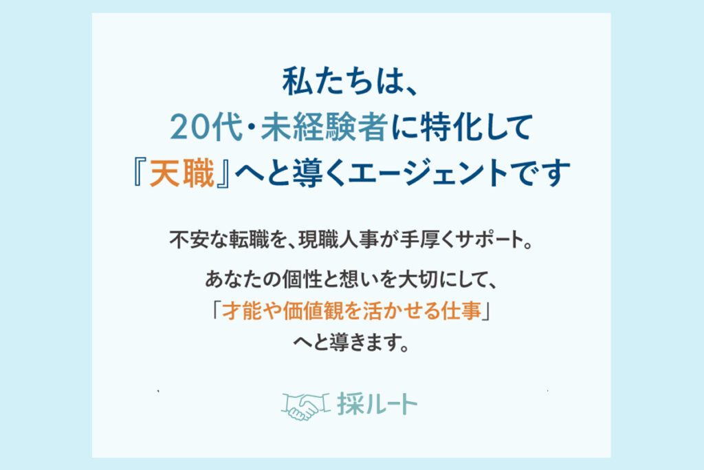 採ルートは、未経験者の転職支援に特化して「天職」へと導くエージェントです。「想いをカタチに」を合言葉に、採用の裏側を知る現役人事が手厚くサポート。あなたの想いを大切に、個性や価値観を活かせる転職を支援します。