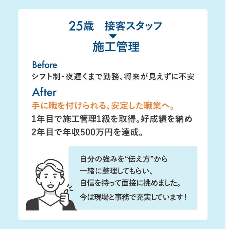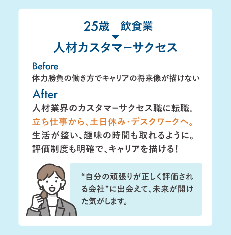 悩みを解決し、想いを活かして未経験からの転職が成功した事例です。ほかにも多数のケースがありあす。