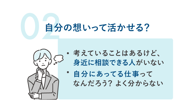 - 転職相談できる人がいない。「自分に合う仕事って何だろう?」と迷ってしまう。