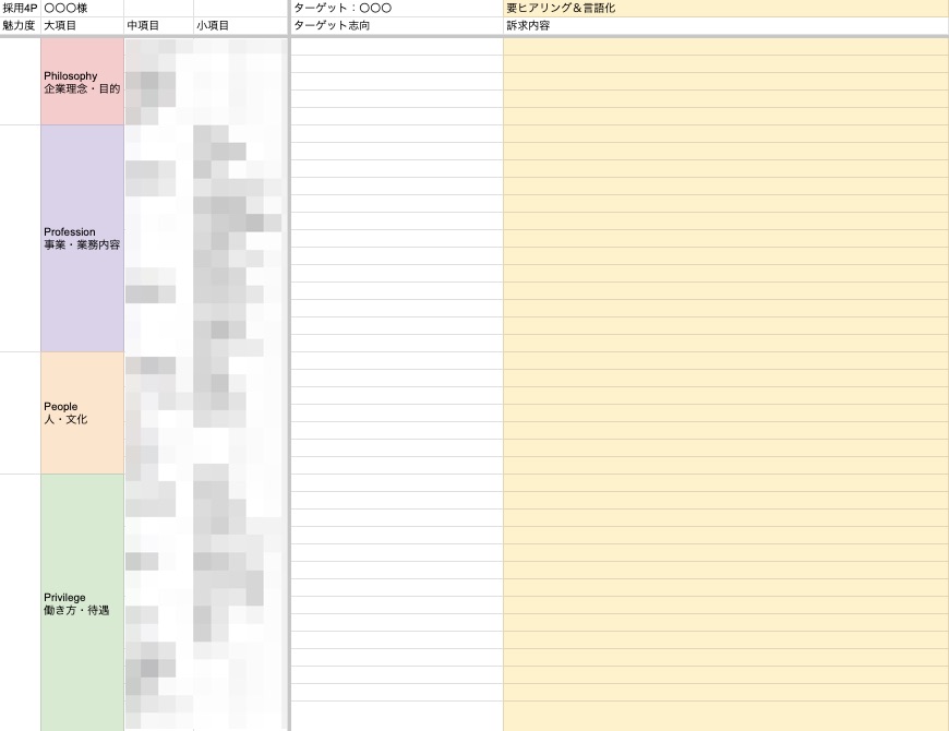「Philosophy(企業理念・目的)」「Profession(事業・業務内容)」「People(人・文化)」「Privilege(働き方・待遇)」の4つのPを大項目として設定し、それぞれの項目の中に中項目、小項目といった形で要素を分解していきます。